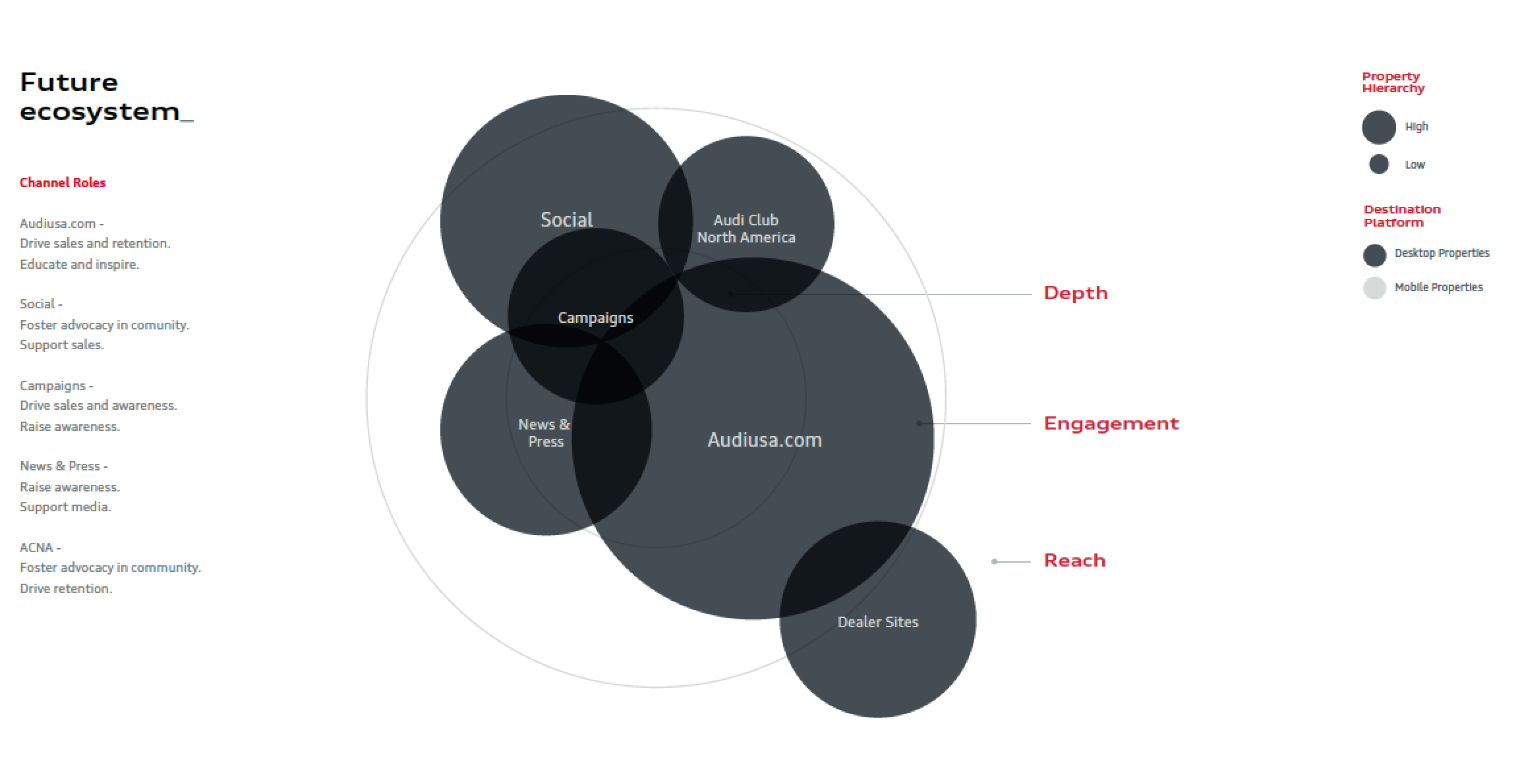 In addition, the Audi dealer network was critical to increasing acquisition and ongoing engagement at a local level. Access between the models online and those available within the network were largely disconnected. Increasing cohesiveness and relevance between models on the site and multiple dealers would streamline sales and increase repeat buyers.