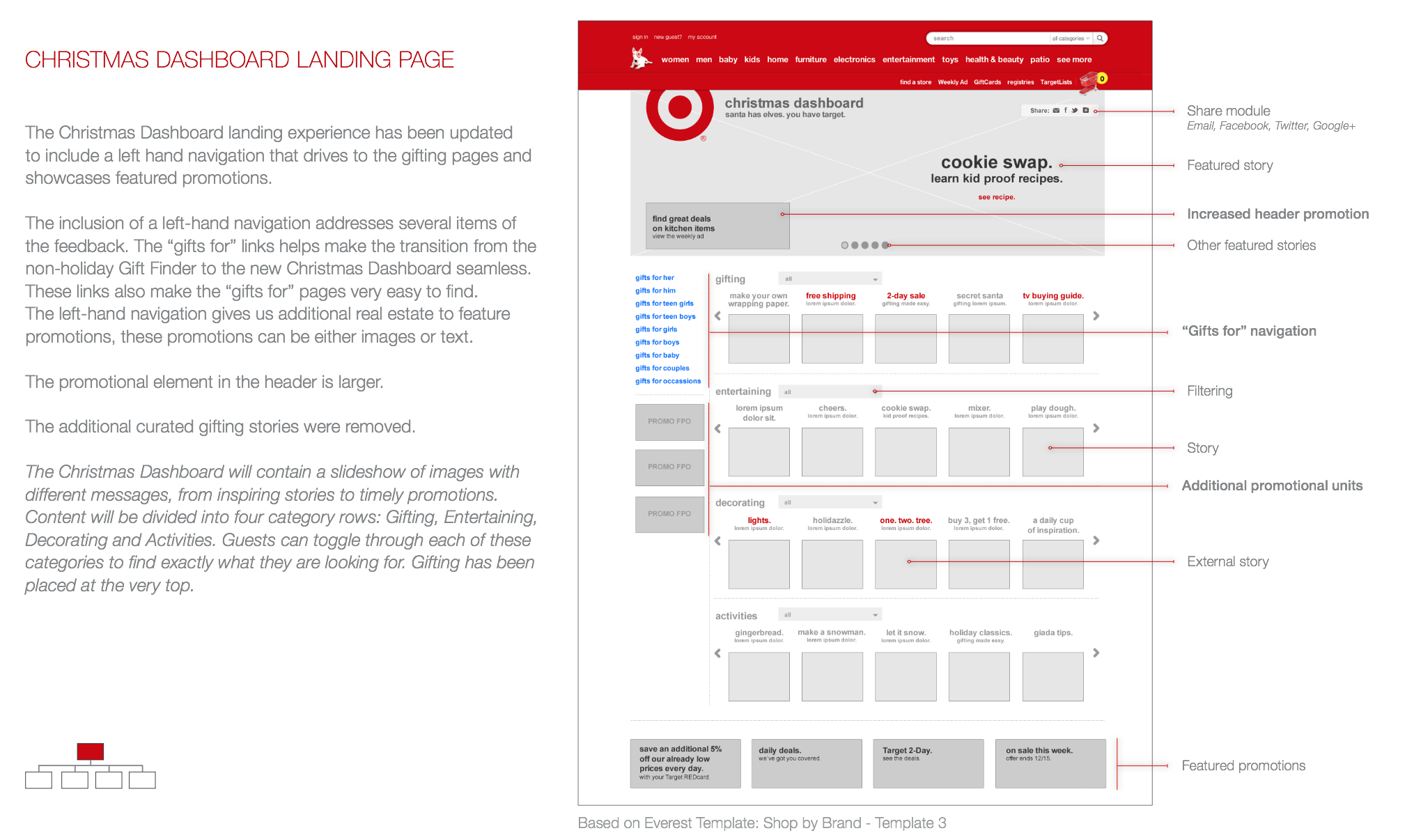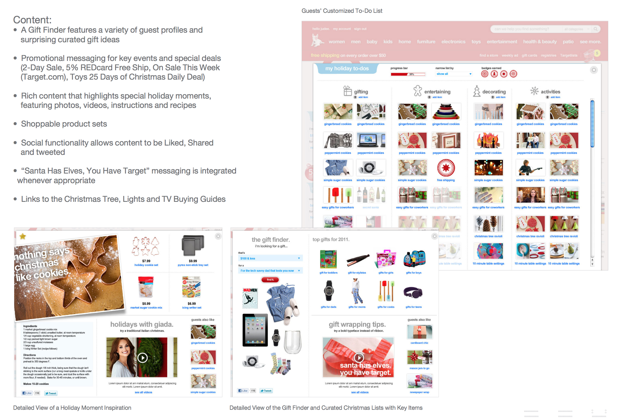 By utilizing the new Target.com “everest” framework, holiday campaign creative, 3rd party content sources, gift finder and list making services, we began ideation which included a timeline for which allowed for a deepening of the engagement over a 12 week period of time.